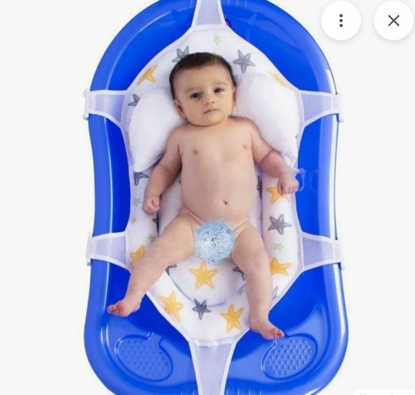 Yıldız desenli yumuşak minderli, sentetik kumaştan mavi bebek yıkama filesi, banyo sırasında nazik destek sağlar.
