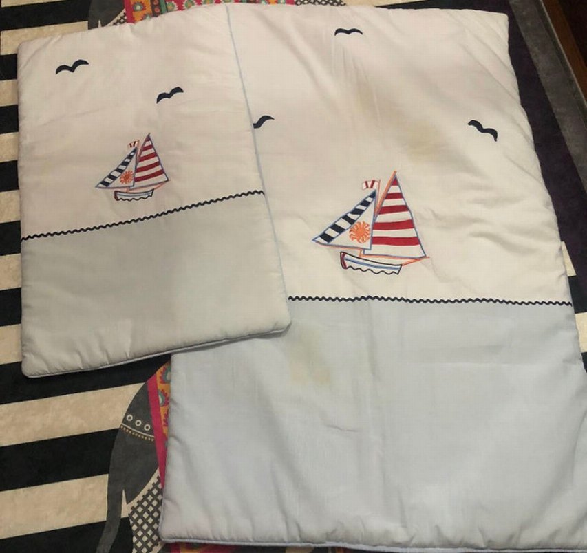 Çok renkli nakışlı yelkenli desenlerine sahip, yumuşak sentetik kumaştan çocuk uyku seti. Yastık ve battaniye içerir. ⛵