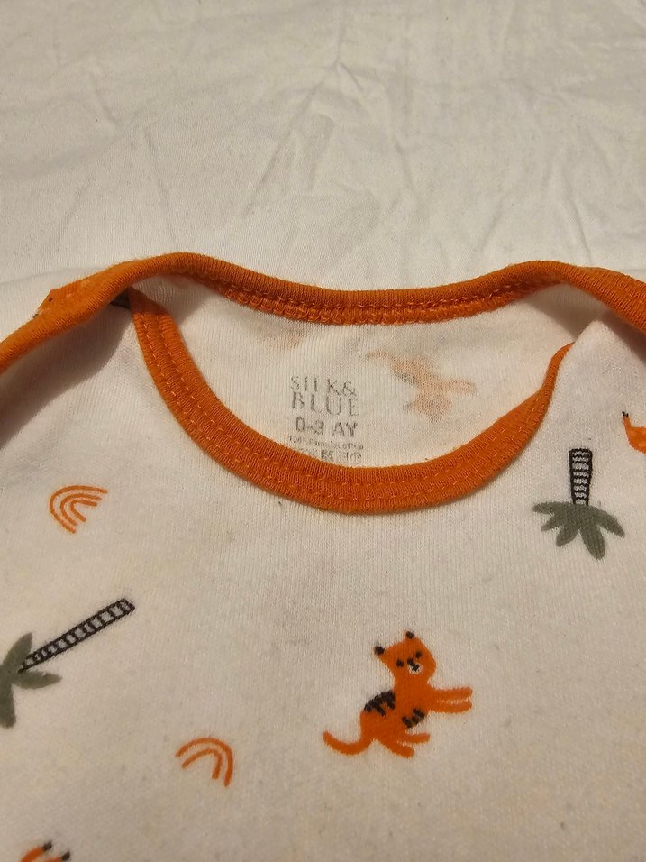 desenli, turuncu ve gri renklerde 0-3 ay bebek zıbın Yumuşak kumaş ve eğlenceli tasarıma sahiptir.