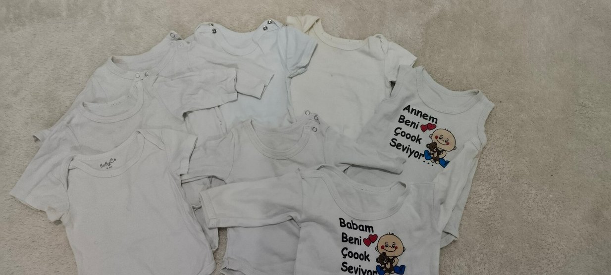 1 ile 6 ay arası bebek zıbın,uzun kolluda var kısa kolluda var. durmaya bağlı sararma var. 8 adet zıbın