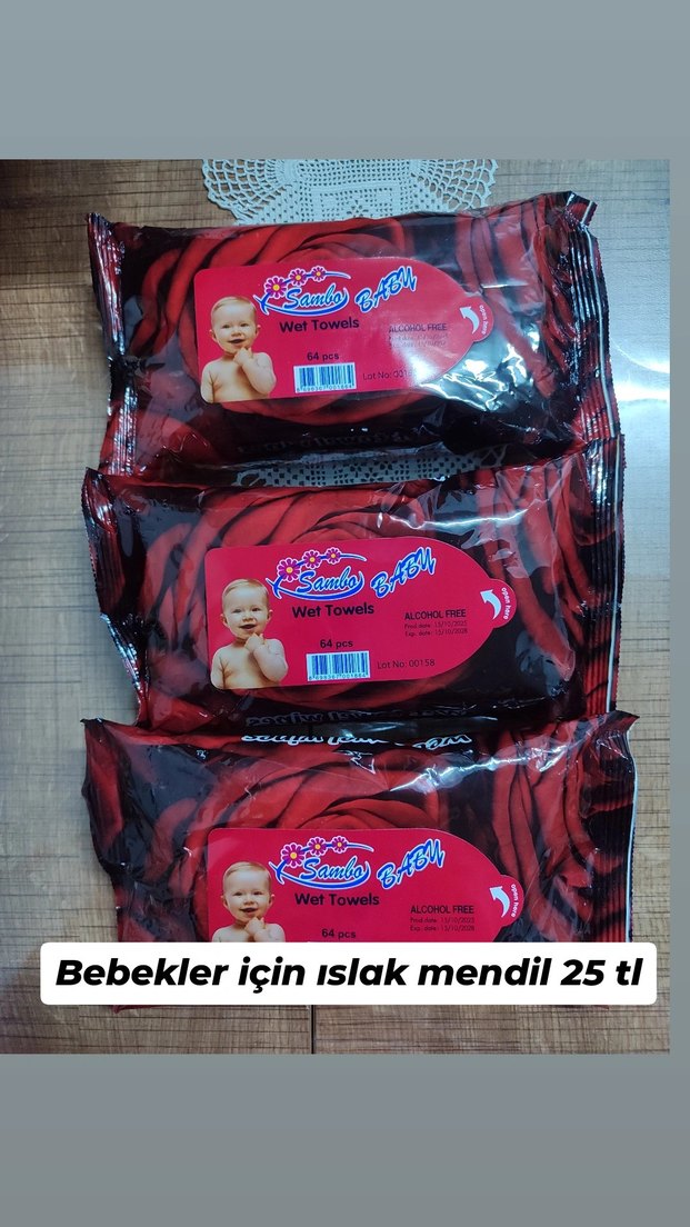 Alkol içermeyen, bebekler için 64 adet ıslak mendil paketi. Hassas cilt temizliği için uygundur. Fiyatı 25 TL.