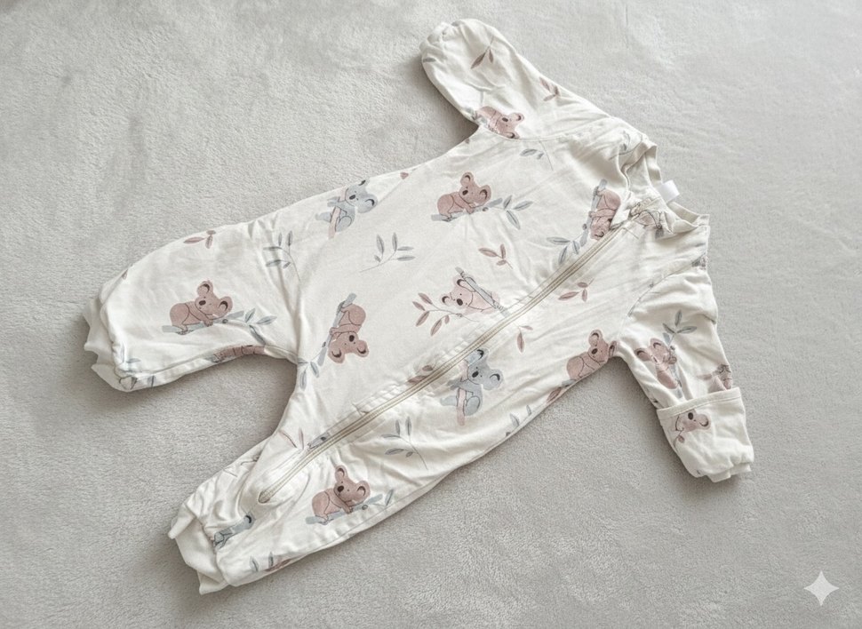 Yumuşak sentetik kumaştan yapılmış, beyaz zemin üzerine pastel baskılı desenlere sahip bebek uyku tulumu. 1.6 tog temiz durumda