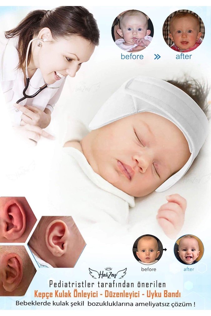Bebekler için yumuşak kumaştan beyaz uyku bandı, pediatristler tarafından kulak şekil bozukluklarını önlemek için önerilir. Ayarlanabilir ve konforludur.