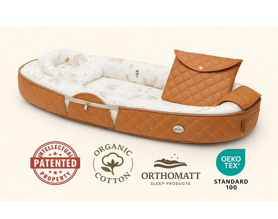Bebek uyku seti, organik pamuklu kumaş ve uyumlu çanta içerir.