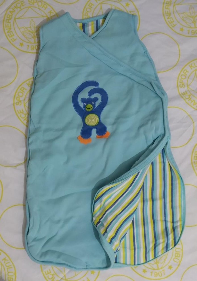 Yumuşak mavi kumaş üzerine renkli baskılı ayı deseni ve çizgili astar ile çocuklar için sıcak tutan battaniye. 6-12ay/76-80 uygundur. cok az kullanılmıştır..