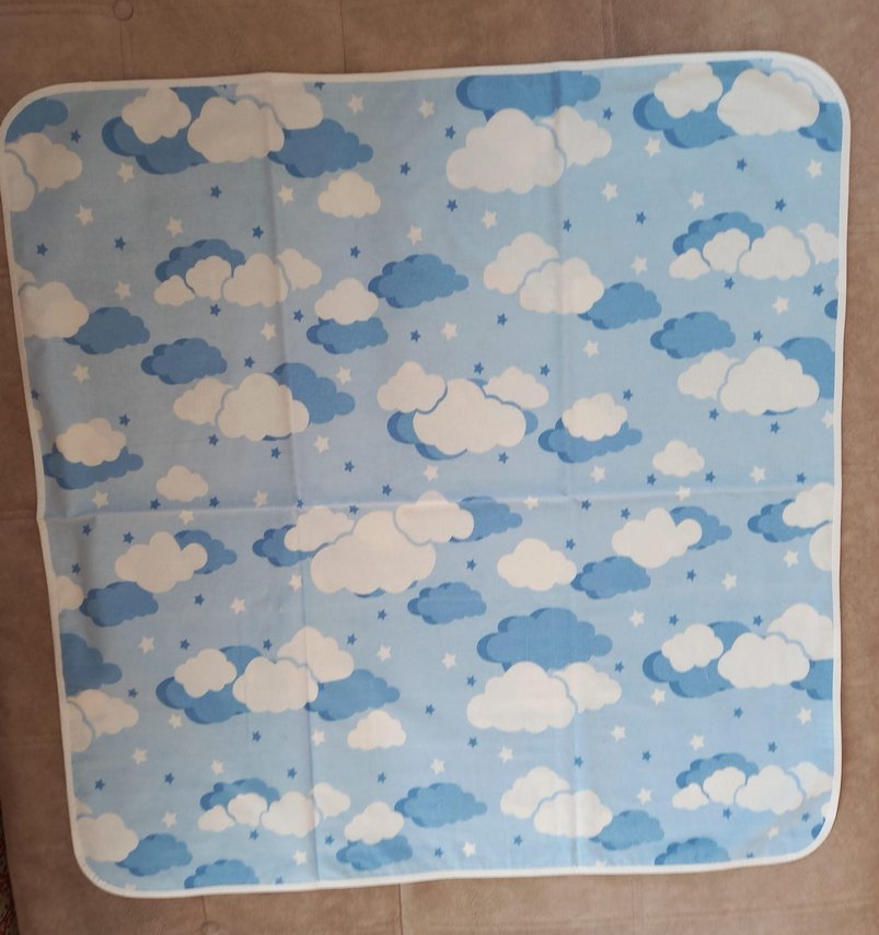 Pastel mavi renkte, bulut desenli, yumuşak sentetik kumaştan çocuk battaniyesi. ☁️