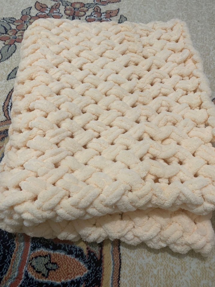 Pastel beyaz renkte, desen içermeyen yumuşak örgü bebek battaniyesi, sıcaklık ve konfor sağlar.Hiç kullanılmadı defosuz indirim için yazabilirsiniz.kendim ördüm