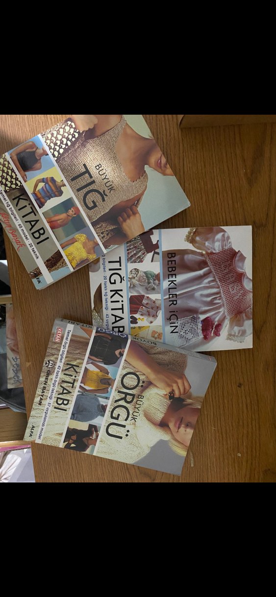 Bebekler için örgü ve tığ işlerine yönelik desenler içeren dergi seti.