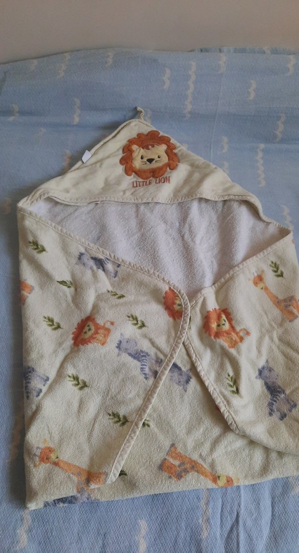 Pastel renklerde hayvan desenli, kapüşonlu ve "LITTLE LION" yazılı yumuşak çocuk battaniyesi. Ana rengi açık sarıdır.