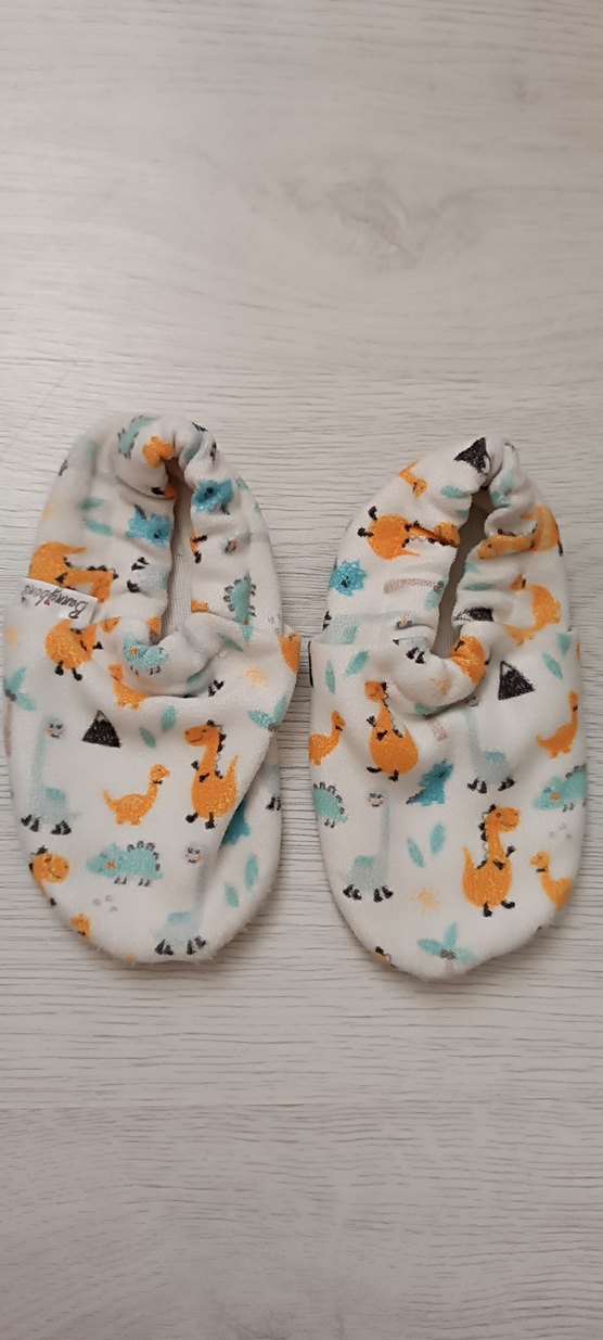 Yumuşak beyaz , renkli baskılı desenlere sahip, rahat keçe kumaşlı erkek bebek patiği.