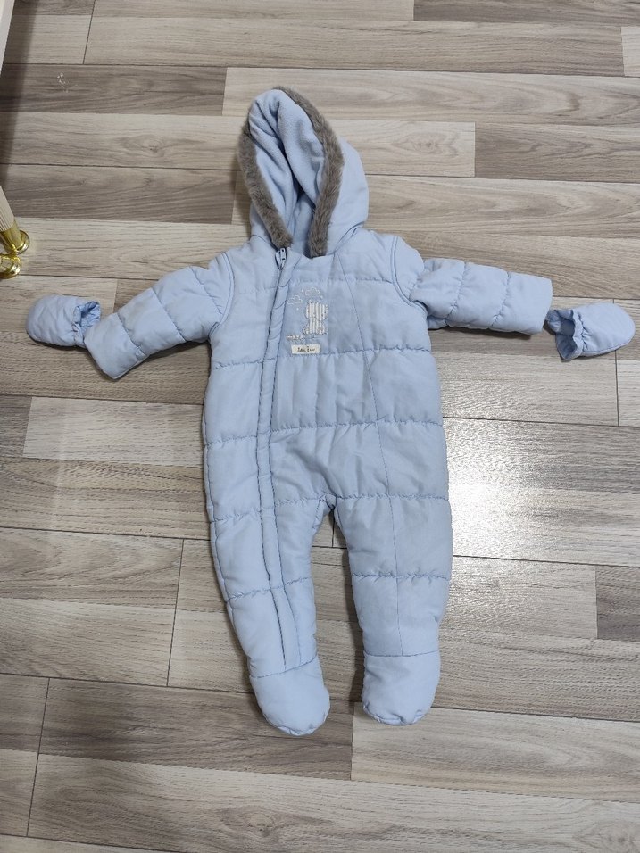 Pastel mavi renkte, kapüşonunda kürk detaylı