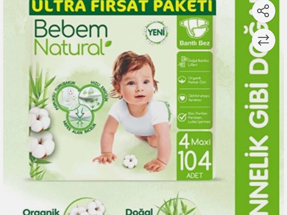 BEBEM Natural 4 Maxi bantlı bebek bezi 104 adet. Doğal bambu liner, organik pamuk yüzey ve sızıntıya karşı koruma sağlar. Klor, parfüm ve lateks içermez.