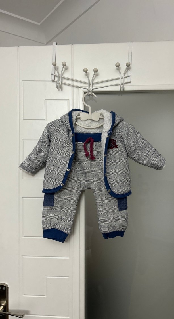 Mavi beyaz renkli, örgü desenli, kapüşonlu ve uzun kollu erkek bebek takımı. Yumuşak ve sıcak fleece kumaştan üretilmiştir, rahat sokak stili sunar.