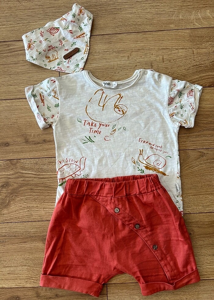 Hem erkek hem de kız bebeklerin yazın rahatlıkla giyebilecekleri çok şık bir takım. Tshirt, şort ve yakalık olarak 3 parçadan oluşuyor. 1-2 defa ancak giyilmiştir. Kıyamadığım için giydirmedim, bir baktım maalesef küçülmüştü! Bu yüzden yepyeni kaldı. Alacak olan güzel günlerde kullansın.