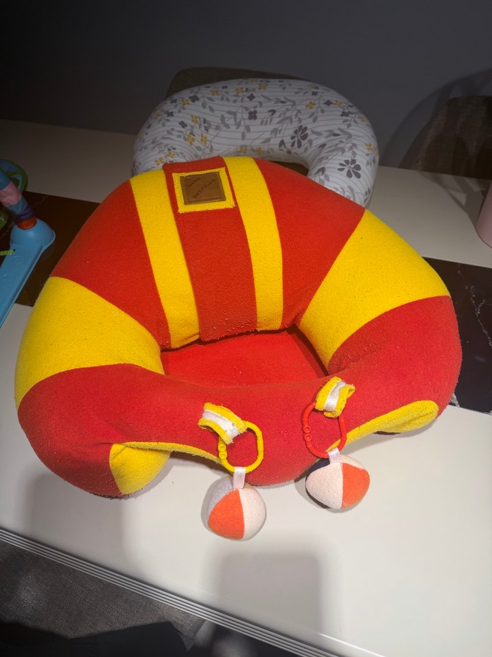 Aldım ama bebeğim hiç sevmedi malesef. Yumuşak ve sıcak kumaştan, kırmızı ve sarı renklerde desenli renkli çocuk boyun yastığı. İki küçük top aksesuarı bulunur.