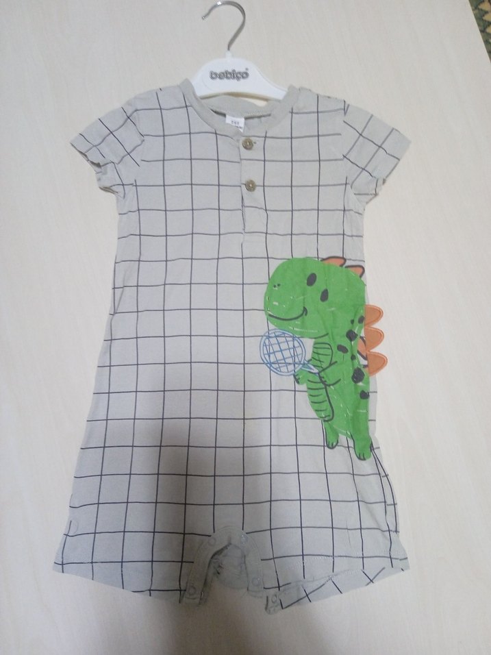 Gri renkli, kısa kollu ve düğmeli ön kısmı olan bebek tulumu. Kareli desen ve yeşil dinozor baskısı bulunur. Yumuşak sentetik kumaştan, street wear tarzında.