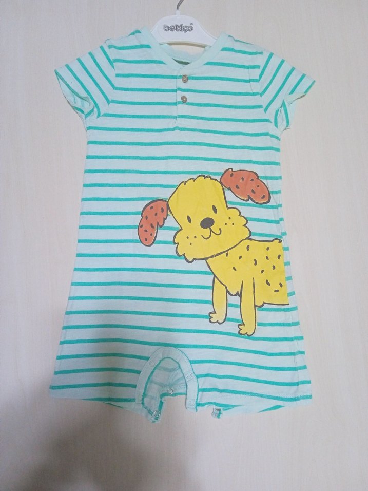 Bebico marka, kısa kollu, düğmeli ve yuvarlak yaka erkek bebek tulumu. Pamuk kumaştan, pastel mavi çizgili ve sevimli köpek baskılı.