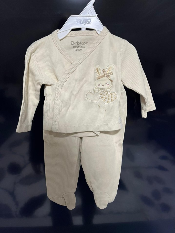 Bebicof marka, düğmeli, beyaz renkli, yumuşak dokulu bebek hastane çıkışı takımı. Üstünde sevimli tavşan desenli. Sapka ve Eldiveni de mevcut. (Yenidogan)