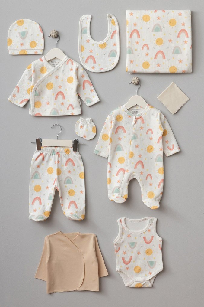 Yumuşak pamuktan yapılmış, açık renkli ve neşeli baskılı desenli şapka, önlük, eldiven, ceket, pantolon, tulum, body ve battaniye seti.
