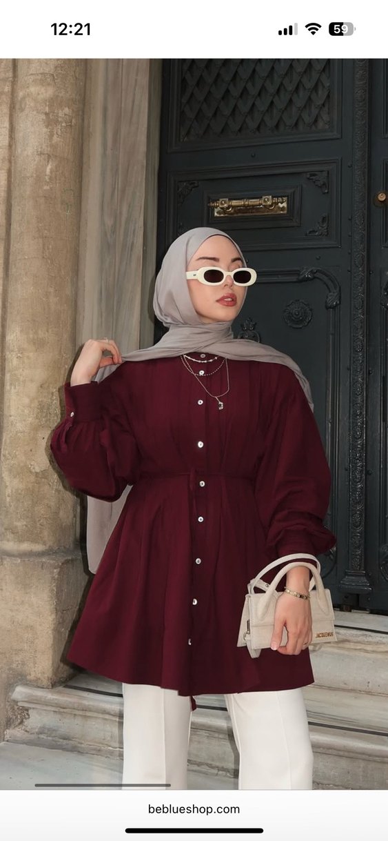 2 defa giydim bendeki kahverengi Bordo renkli, dökümlü ve uzun kollu midi tunik. Yüksek yakalı, etnik desenli ve ipeksi dokulu, sade ve modest tarzda günlük kullanıma uygun.
