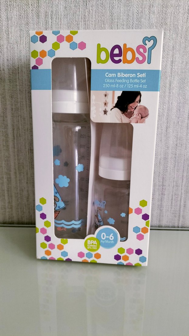 Bebs markasına ait 0-6 ay için uygun, BPA içermeyen 250 ml ve 125 ml cam biberon seti. Pastel mavi renkte.