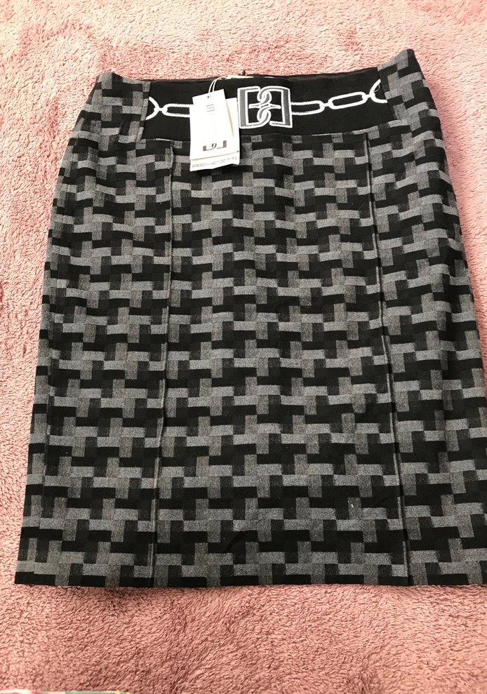 Desenli, gri renkli ve kemerli midi uzunlukta kalem etek. Ofis ve günlük sokak stiline uygun, sentetik kumaştan üretilmiştir.