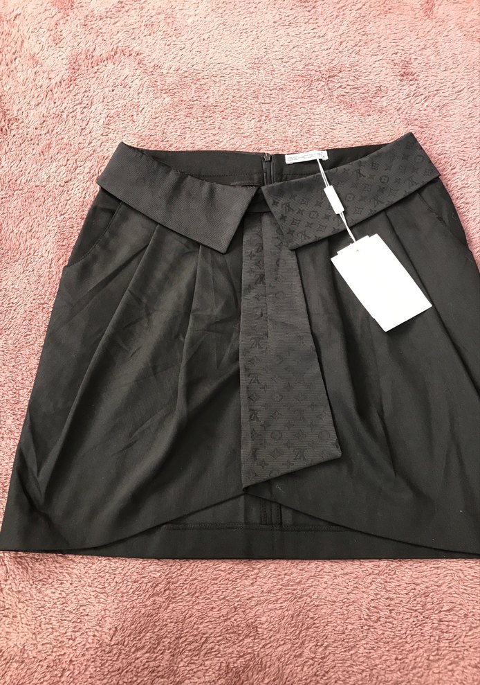 Siyah, kemerli, desenli kemer detaylı, bol kesim ve ipeksi dokulu mini kadın eteği. Ofis stiline uygun, normcore ve avangart tarzda.