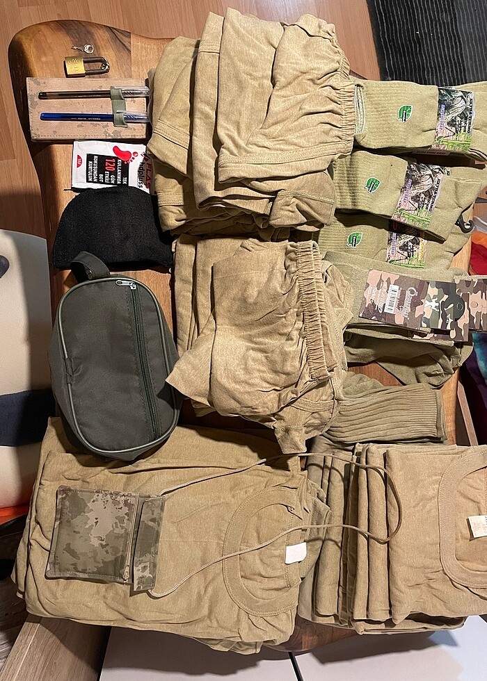 Bedelli Asker Paketi Asker için alınmıştır ancak hiç kullanılmamıştır. Medium veya Large giyenler için uygundur 20 T-Shirt 23 Boxer 21 Çorap 1 Boyna Asmalı Asker Cüzdanı 1 Kilit ve Anahtar 1 Küçük Eşya Çantası 1 çift Vatka 2 Paket Ayakkabı Tozu 5 Adet Temiz ve Kirli Çamaşır Torbası 1 Askerin Not Defteri 2 Tükenmez Kalem