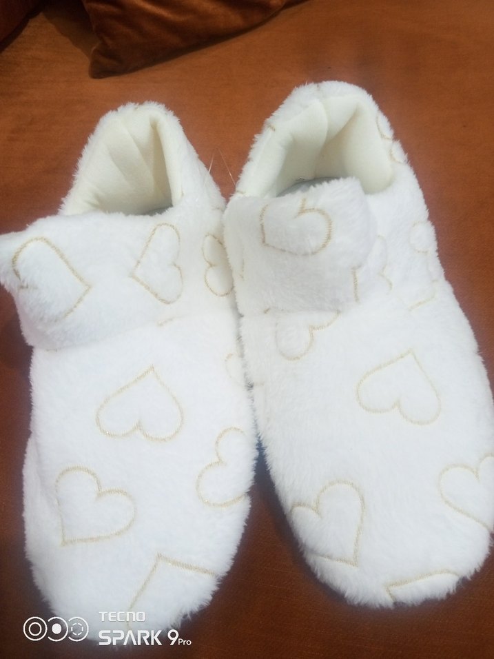 Yumuşak kürklü ve nakışlı kalp desenli beyaz kız çocuk terliği. Hafif renkli ve rahat, geleneksel tarzda sıcak tutar.