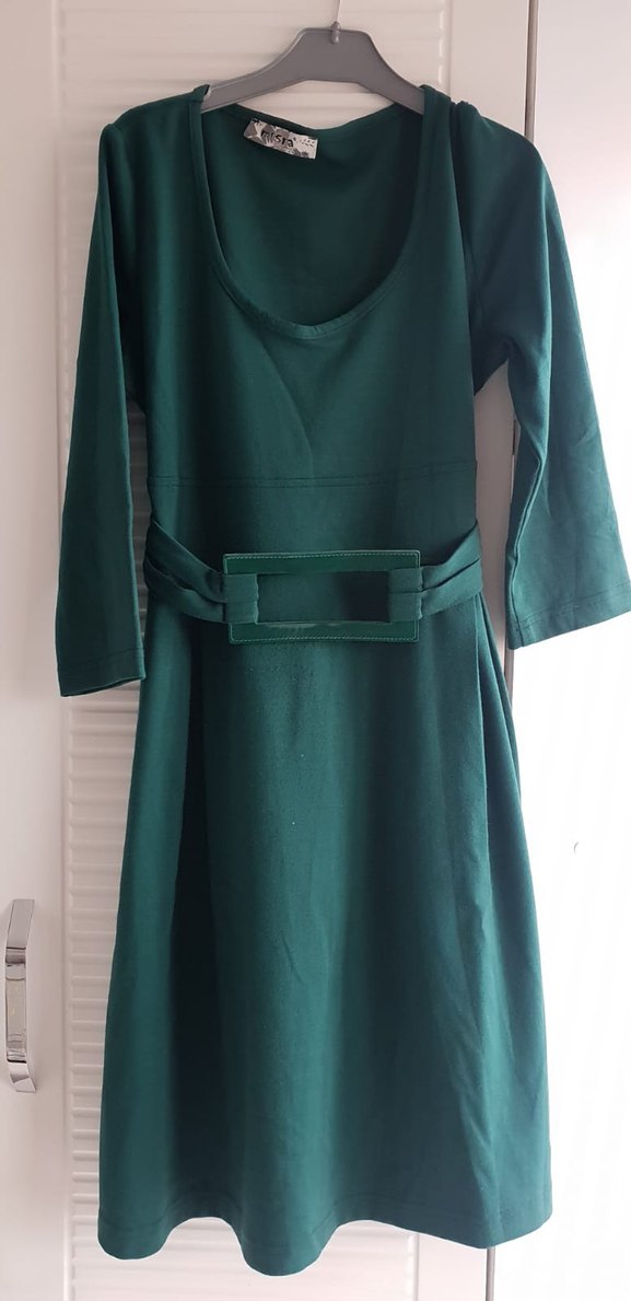 Kemerli, koyu yeşil renkli, tek parça midi triko elbise. Kayık yaka ve ince askılı kollara sahip, yumuşak sentetik kumaştan üretilmiştir. Ofis kullanımı için uygundur.