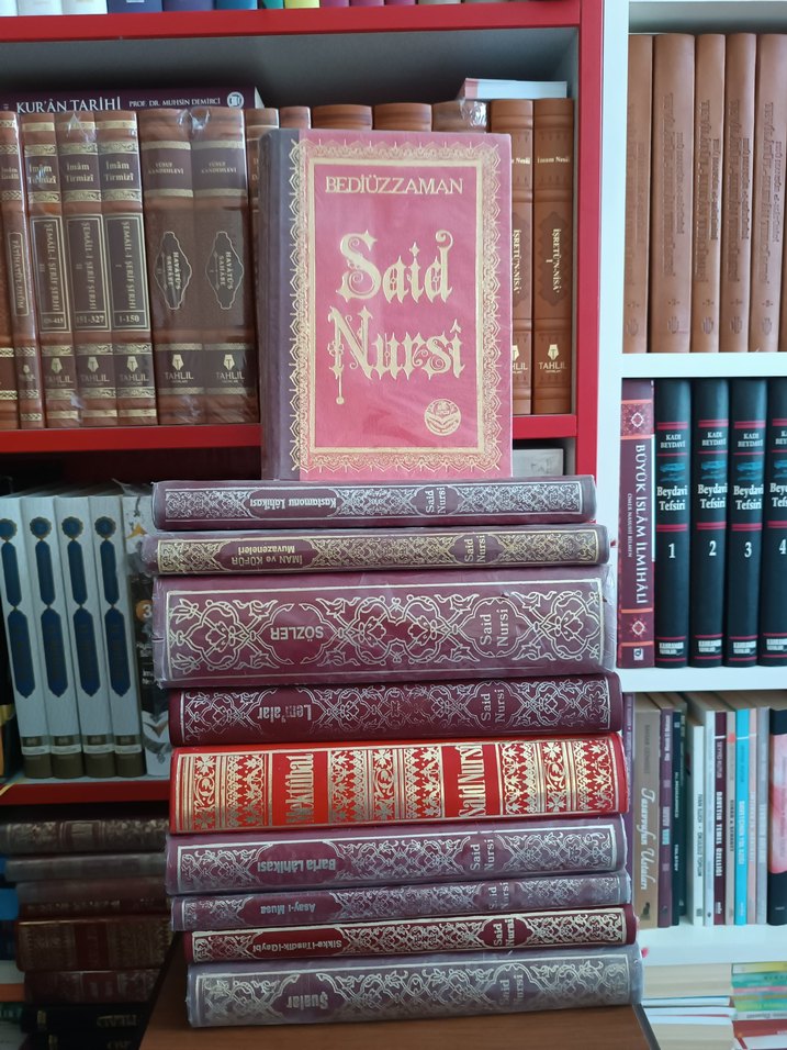 Bediüzzaman Said Nursi'nin dini kitaplarından oluşan, geleneksel desenli detaylı kapaklara sahip bir set.