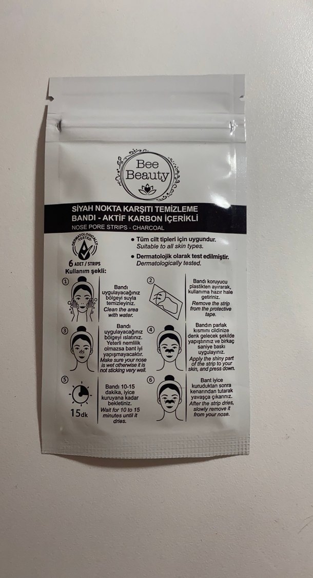 Bee Beauty aktif karbon içeren siyah nokta bandı, gözenekleri temizler ve siyah noktaları giderir. Dermatolojik olarak test edilmiştir, tüm cilt tiplerine uygundur. İçerisinde 6 adet var. Stok yapmıştım elimde fazla olduğu için satıyorum. Kutusunu aldığımda çöpe atmıştım.