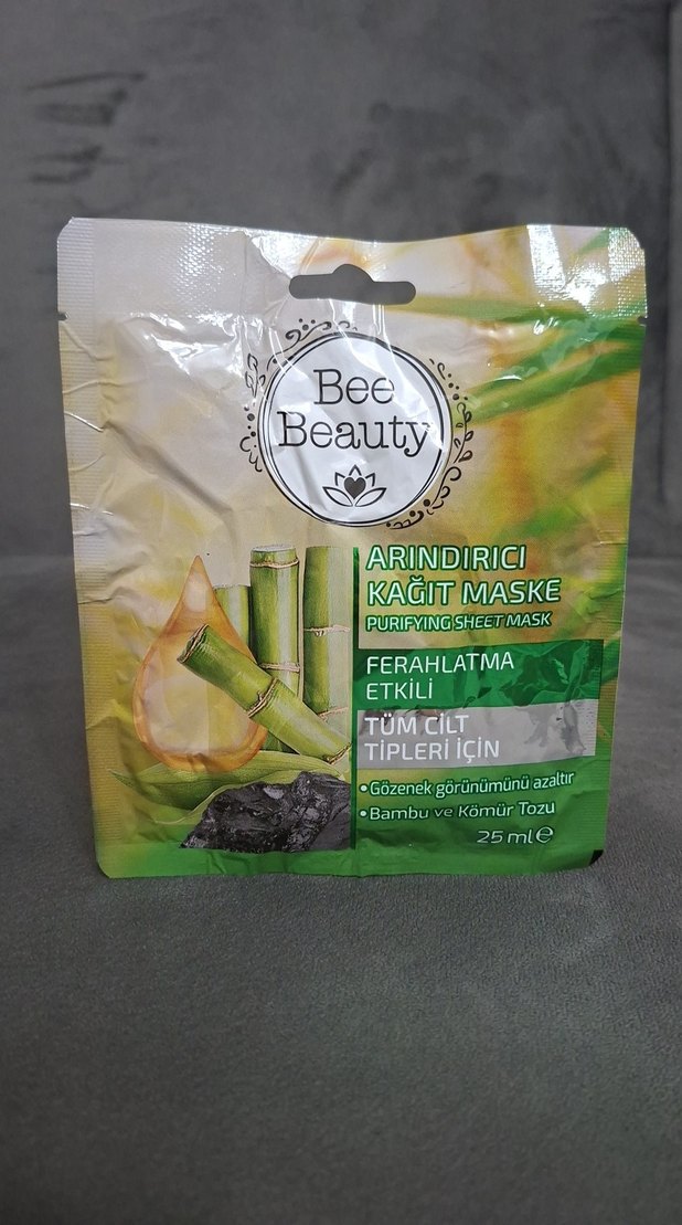 Bee Beauty arındırıcı kağıt maske, bambu ve kömür tozu içerir. Gözenek görünümünü azaltır ve tüm cilt tipleri için ferahlatıcıdır. 25 ml.