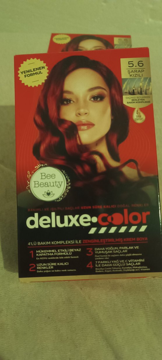 Bee Beauty Deluxe Color kızıl saç boyası, 4'lü bakım kompleksiyle uzun süre kalıcı, yoğun renk ve mükemmel beyaz kapatma sağlar.