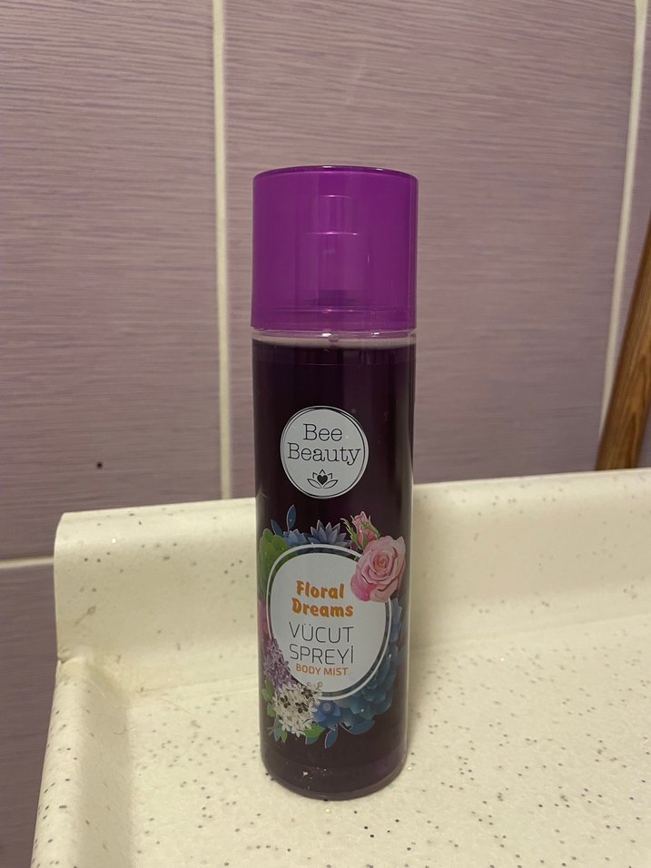 Bee Beauty Floral Dreams vücut spreyi, mor kapaklı şişede çiçeksi bir koku sunar. Tamamen doludur. Bir iki defa sıktım sadece.
