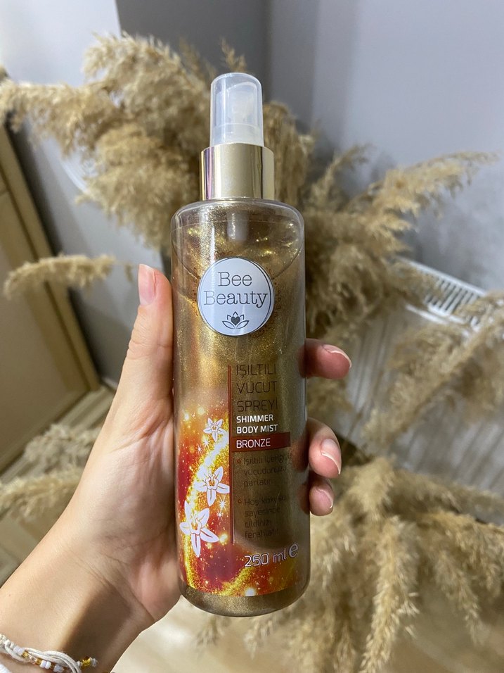 Bee Beauty ışıltılı bronz tonlarda vücut spreyi, cilde parlak bir görünüm sağlar. 250 ml sprey şişede, kolay kullanım sunar. Kendine özgü zarif ışıltıları ile dikkat çeken, uygulama sonrasında tende hoş bir parlaklık elde etmeye yardımcı olan vücut spreyi duştan sonra ya da isteğe bağlı olarak günün her anında kullanılabilir. Hafif formülü ile uygulama sonrasına yapış yapış bir his bırakmayan, cildi ferahlatan ve ışıkla buluştuğunda hoş bir görüntünün ortaya çıkmasına katkıda bulunur. Ben çok az kullandım, fotoğrafta da görebilirsiniz. STK’sı geçmiş gözüküyor ama herhangi bir problemi yok. Hoş bir kokusu var ve ışıltısı güzel. Artık kullanmadığım için satıyorum.