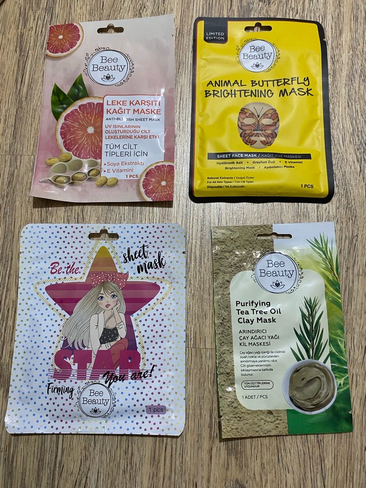 Bee Beauty'nin dört adet kadın yüz maskesi seti; arındırıcı çay ağacı yağı kil maskesi, aydınlatıcı hayvan kelebek maskesi, leke karşıtı soyalı ve E vitaminli kağıt maske ve sıkılaştırıcı kağıt maske içerir. 4 lü gönderim sağlanacaktır. Ürünler kullanılmamıştır. Değişim ve iade yoktur.