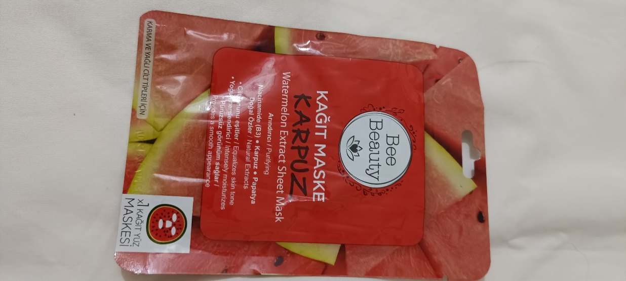 Bee Beauty Karpuz Özlü Kağıt Maske, cildi yoğun nemlendirir, arındırır ve doğal özlerle cilt tonunu eşitler.