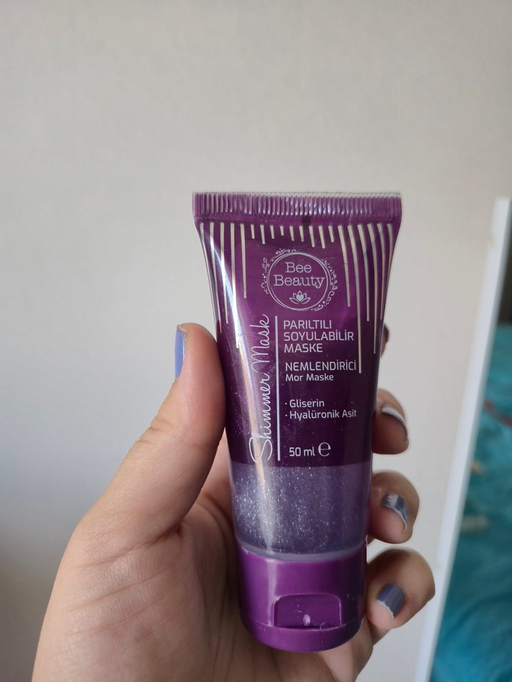 Bee Beauty mor parıltılı soyulabilir maske, cildi nemlendiren gliserin ve hyaluronik asit içerir. 50ml tüpte sunulur. sadece 1 kez kullandım