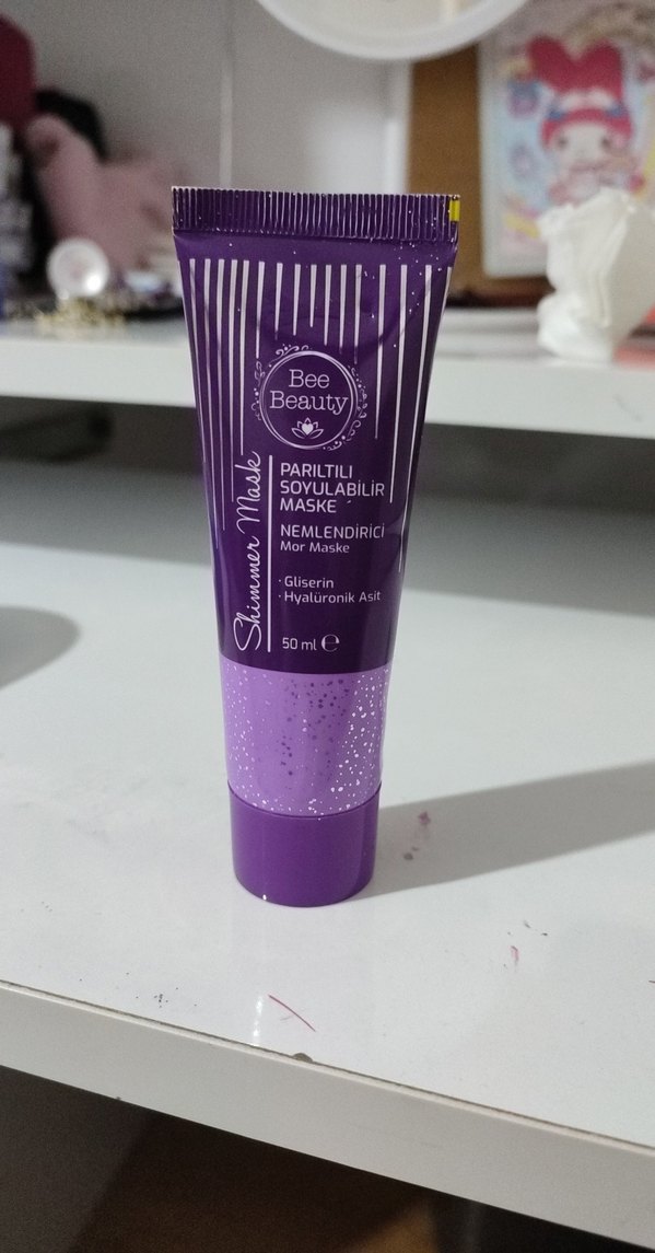 Bee Beauty mor parıltılı soyulabilir maske, gliserin ve hyaluronik asit içerir. Nemlendirici özellikli 50 ml tüpte HİÇ KULLANILMADI