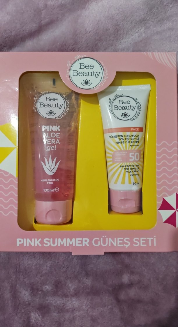 Bee Beauty Pembe Yaz seti, nemlendirici Aloe Vera jeli (100ml) ve SPF 50 güneş koruyucu yüz kremi (50ml) içerir.