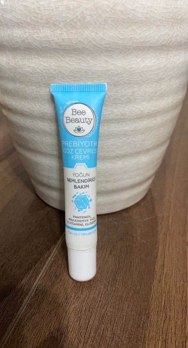 Bee Beauty prebiyotik göz çevresi kremi, panthenol, makadamiya yağı, E vitamini ve gliserin ile yoğun nemlendirme sağlar. 2/3 ml kullanıldı