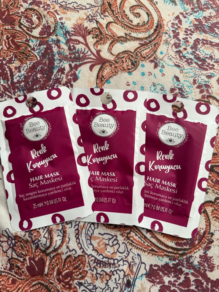 Bee Beauty saç maskesi, saç rengini korur ve nemlendirir. 25 ml tek kullanımlık paketlerde sunulur. ♀️