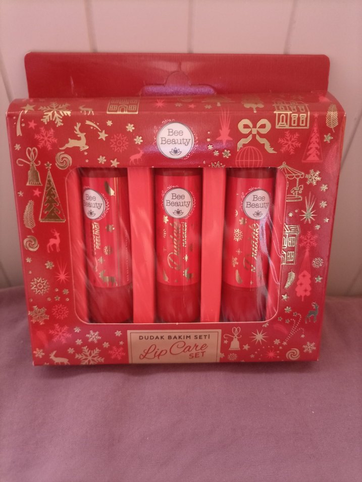Bee Beauty dudak bakım seti, üç renkli kırmızı dudak bakım ürününden oluşur. Dudakları nemlendirir ve korur. PipCare markası yer alır.