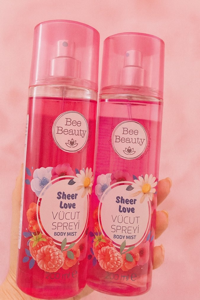Bee Beauty Sheer Love vücut spreyi, çiçek desenli şişesi ve hafif, ferahlatıcı kokusuyla gün boyu kullanıma uygundur.