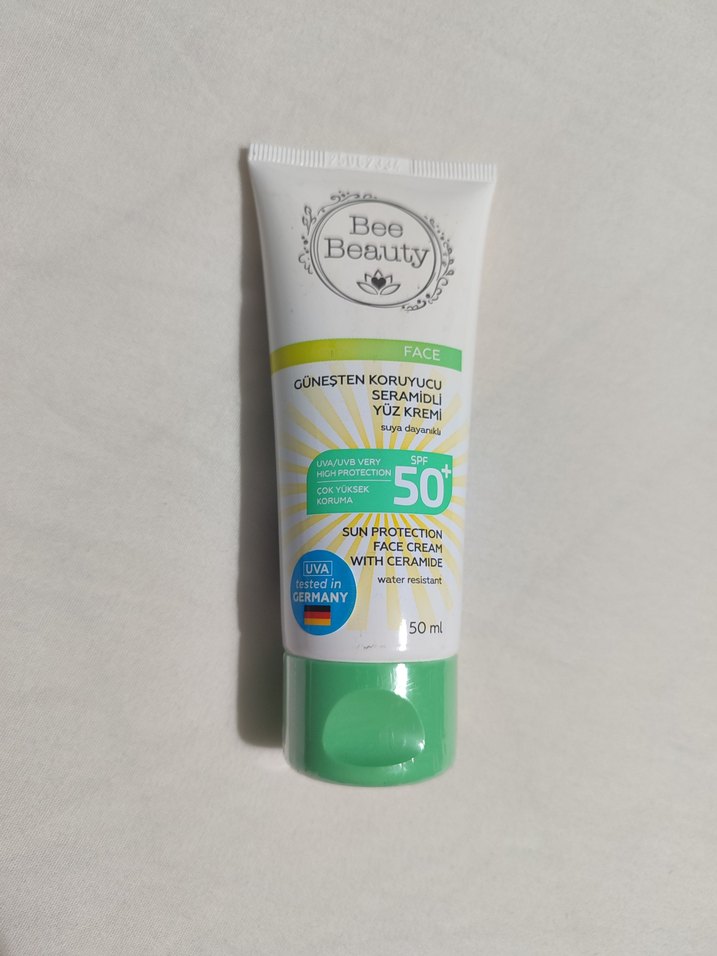 Bee Beauty yüz kremi, SPF 50+ yüksek güneş koruması ve seramid içeriği ile suya dayanıklı koruma sağlar.