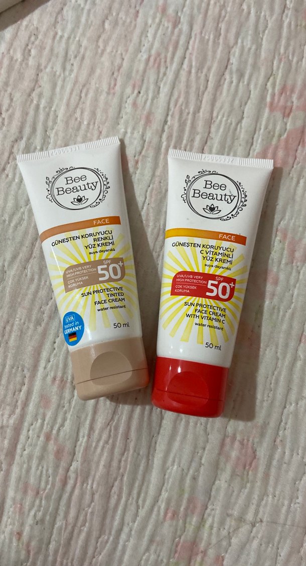 Bee Beauty SPF 50 güneş koruyucu yüz kremleri, renkli ve C vitamini içeren formüllerle, 50 ml tüplerde. Suya dayanıklı, Almanya yapımı. ☀️