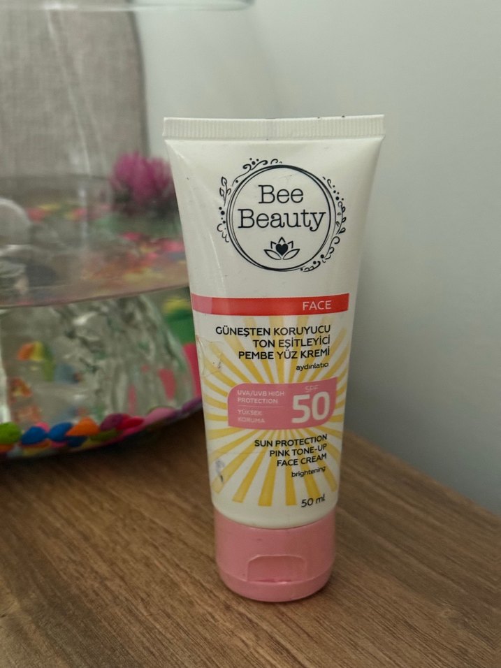 Bee Beauty yüz kremi, SPF 50 güneş koruması sağlar ve ton eşitleyici pembe renklidir. 50 ml ambalajda sunulur. ☀️