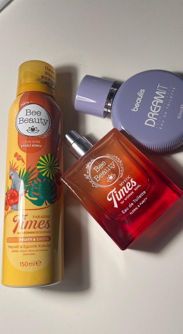 Bee Beauty Times seti, meyveli ve egzotik kokulu deodorant spreyi ve eşleşen eau de toilette içerir, her ikisi de uzun süre kalıcı koku sunar, 150 ml. Asırı ucuza veriyorum ve deodoran ful dolu Parfümlerde öyle azcık kullanıldı kokusu güzel fakat ben kullanamıyorum ve indirimden almıştım o yüzden rastgale aldığım için