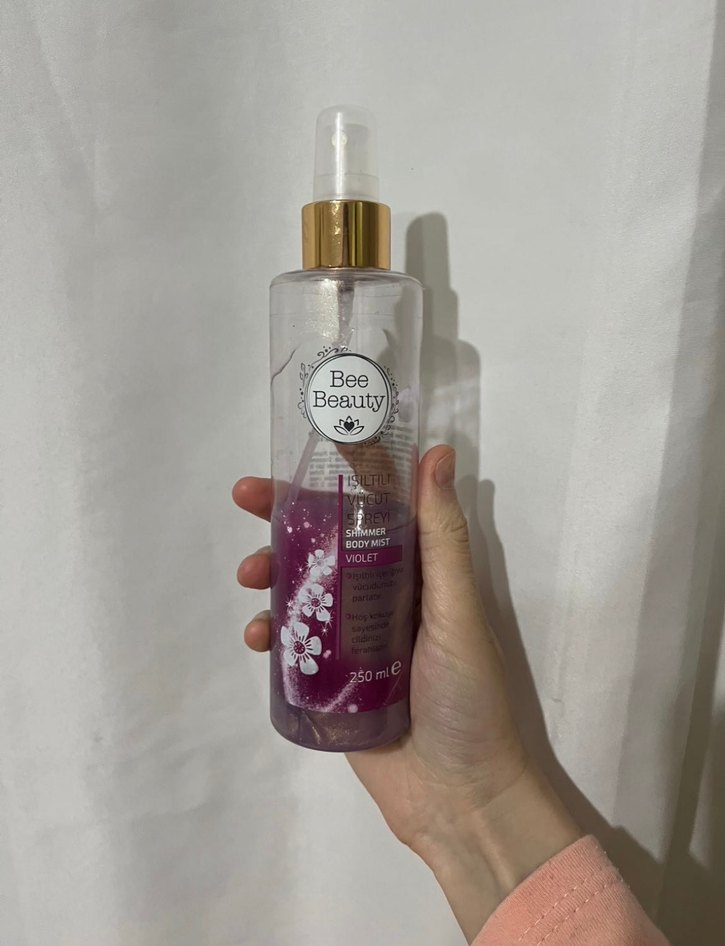 Bee Beauty'nin 250 ml'lik violet ışıltılı vücut spreyi, cilde hafif ve hoş kokulu bir mist sağlar.